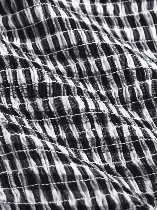 Crafted from 100% Polyester, this Women's off-shoulder flared sleeve grid tube top exudes elegance and sophistication. The unique grid pattern adds a touch of modernity to any outfit. Perfect for summer parties, beach outings, or casual outings with friends. Pair it with high-waisted shorts or a flowy skirt for a chic look.